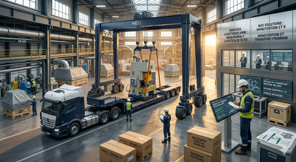 ✔ Étude préalable du site et du volume ✔ Protection et fixation des machines ✔ Transport adapté : camions spécialisés, grúas, contenedores ✔ Coordination avec vos équipes et planning de production